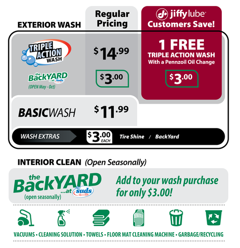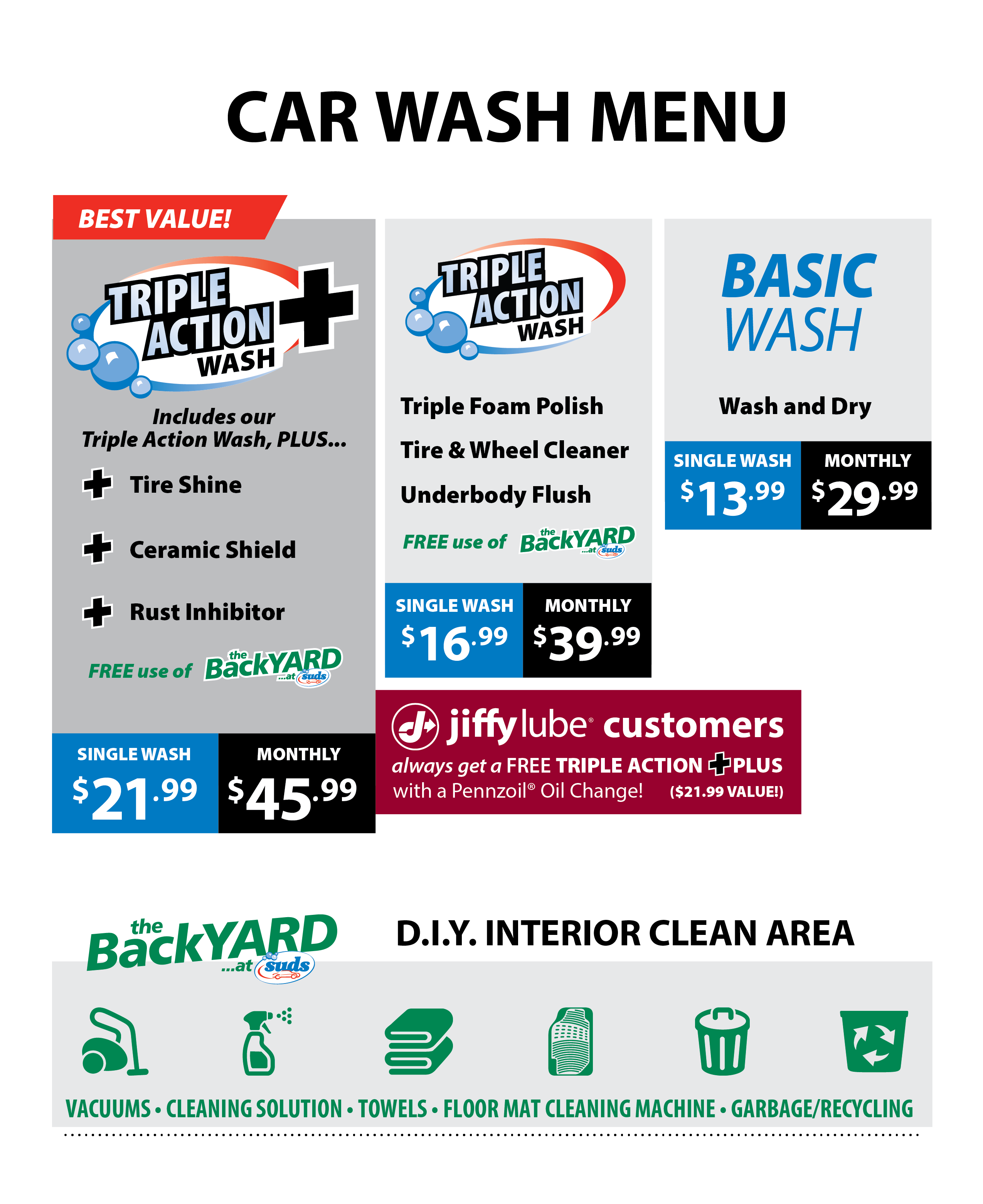 At Suds Car Wash, we offer a range of car wash services tailored to meet your needs. Whether you're looking for a quick wash or a full-service detail, our menu is designed to give your vehicle the perfect treatment.