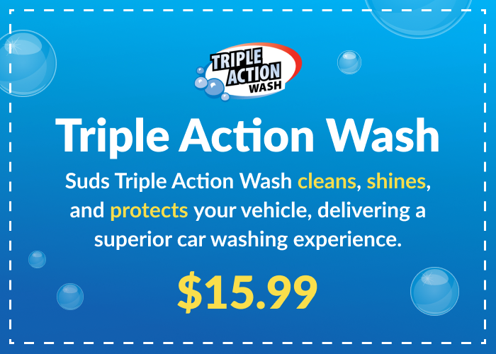 The Triple Action Wash at Suds consists of an exterior and undercar wash that cleans, protects, and shines your vehicle. This VIP experience includes triple foam polish, Tire & Wheel cleaner, and underbody flush.